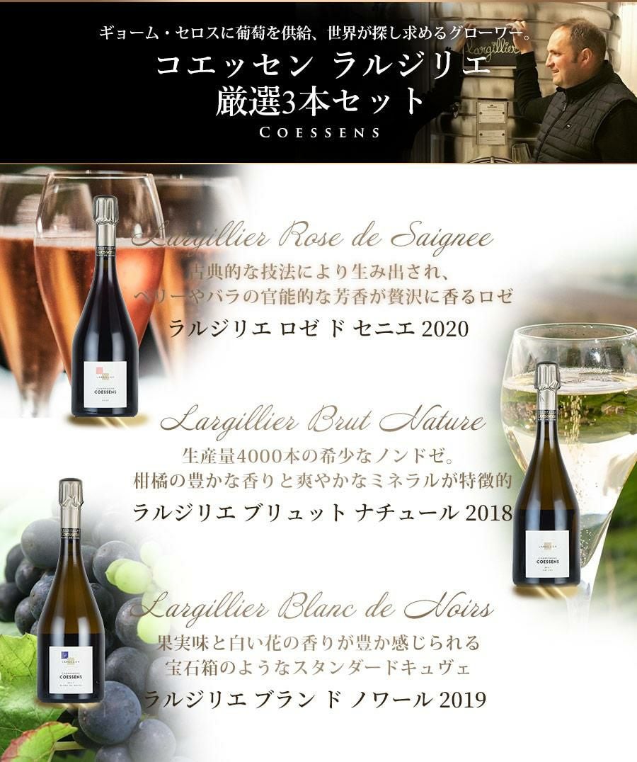他の画像を見る ワインセット Champagne シャンパン Coessens コエッセン Largillier ラルジリエ 厳選3本《ギョーム・セロスに葡萄を供給、世界が探し求めるグローワー 》福袋 送料無料 通常販売価格(税込) ¥ 46,200 税込 会員メンバー価格(税込) ¥ 39,800 税込 送料無料 クール便対応可能 在庫切れ 詳細を見る お気に入りに追加
