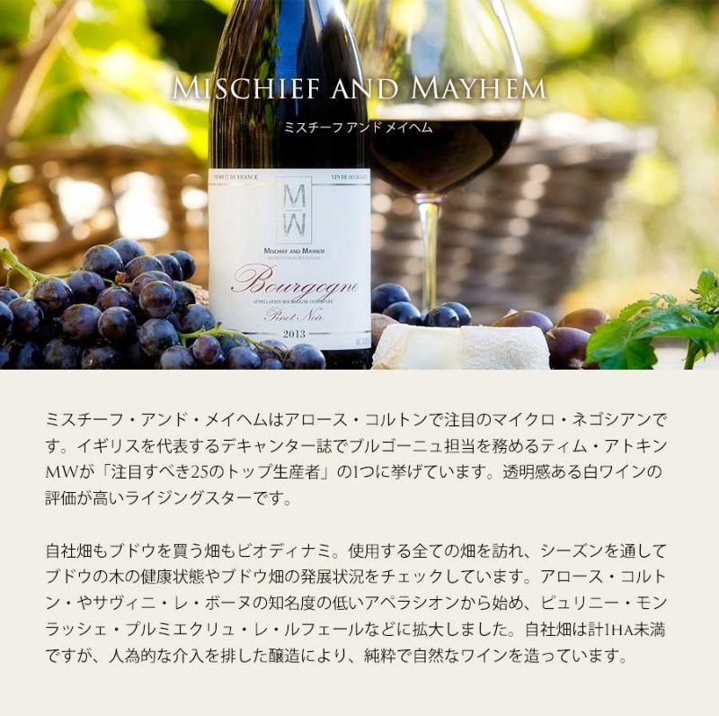 ミスチーフ・アンド・メイヘムはアロース・コルトンで注目のマイクロ・ネゴシアンです。イギリスを代表するデキャンター誌でブルゴーニュ担当を務めるティム・アトキンMWが「注目すべき25のトップ生産者」の1つに挙げています。透明感ある白ワインの評価が高いライジングスターです。