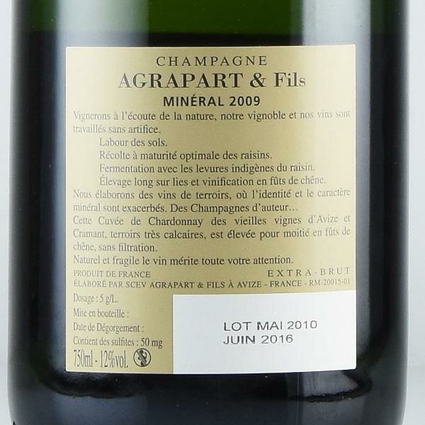 フランスのル・ギド・デ・メイユール・ヴァン・ド・フランスでは、セロス、エグリ・ウーリエと並んで3つ星に輝いています。アンセルム・セロスがシャンパーニュ造りを革新した革命児とすれば、パスカル・アグラパールはコート・デ・ブラン地区の多様な畑を基礎に、テロワール表現の多彩なキュヴェを生産する方向に進んだ職人です。品質の高さは変わりません。生産量は10万本です。