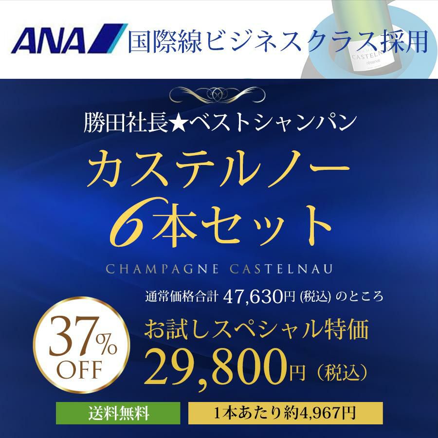他の画像を見る ANA国際線ビジネスクラス採用シャンパンメゾンのお勧め6本セット 勝田社長★ベストシャンパン カステルノー ☆ 6本セット お試しスペシャル特価 送料無料 シャンパーニュ ワインセット 通常販売価格(税込) ¥ 47,630 税込 会員メンバー価格(税込) ¥ 29,800 税込 送料無料 クール便対応可能 在庫切れ 詳細を見る お気に入りに追加