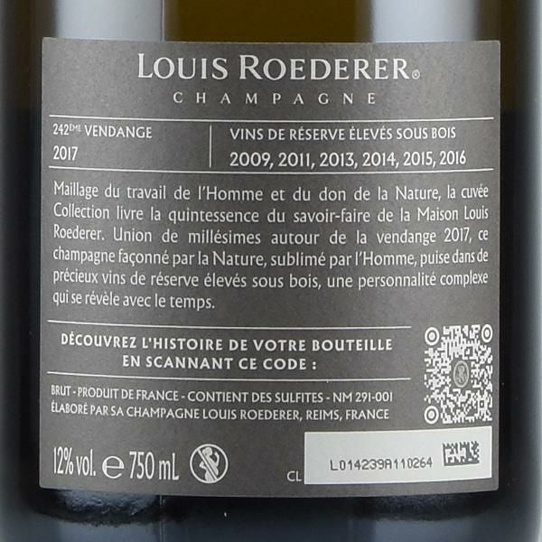 Based on the 2017 vintage, Roederer's NV Brut Collection 242 continues to drink very well, offering up aromas of pear, orange zest, white flowers, almonds and hazelnuts. Medium to full-bodied, ample and fleshy, with racy acids and a bright, saline finish, it's a great success in a challenging base year.