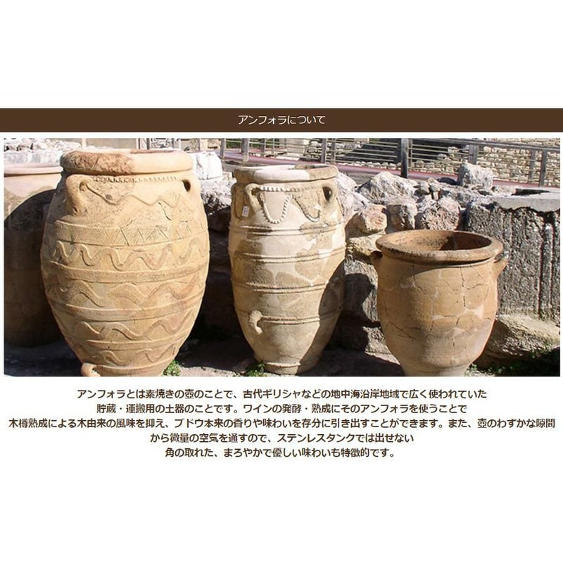 アンフォラとは素焼きの壺のことで、古代ギリシャなどの地中海沿岸地域で広く使われていた貯蔵・運搬用の土器のことです。ワインの発酵・熟成にそのアンフォラを使うことで木樽熟成による木由来の風味を抑え、ブドウ本来の香りや味わいを存分に引き出すことができます。また、壺のわずかな隙間から微量の空気を通すので、ステンレスタンクでは出せない角の取れた、まろやかで優しい味わいも特徴的です。