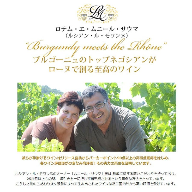 ロテム&ムニール・サウマ(Rotem & Mounir Saouma)です。ブルゴーニュでは他のドメーヌのワインを買い付けて、熟成・瓶詰を行うネゴシアンとして活躍していますが、ローヌでは自ら畑を購入し、ブドウの栽培から熟成までを一貫して行っています。
