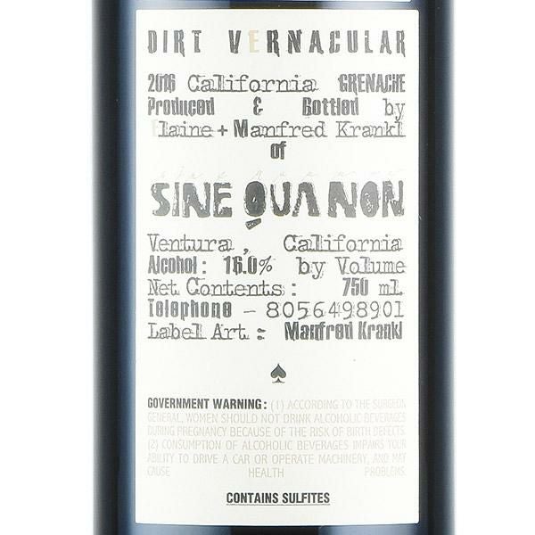 The label of the 2016 Dirt Venacular is based on a picture of a stone imbedded in another stone. The wine is composed of 78% Grenache, 11.5% Mourv?dre, 7% Touriga Nacional and 3.5% Petite Sirah, fermented using 43% whole cluster with the whole cluster mostly used on the Grenache component. The vineyard sources are 42% Eleven Confessions Estate, 25% The Third Twin Estate, 22% Cumulus Estate, 9% Bien Nacido and 2% Molly Aida Estate. It was aged for around 23 months in 38% new French oak, 53% used French oak and 9% concrete. (Issue 243 End of June 2019, The Wine Advocate, 29th Jun 2019)