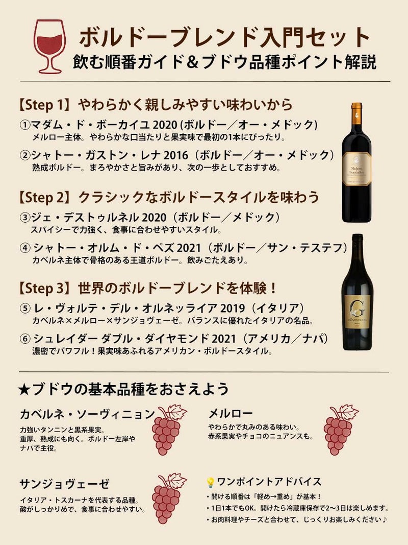 初めてのボルドーブレンド体験セット《カベルネ×メルローの美味しさを知る、6本の旅》【送料無料】