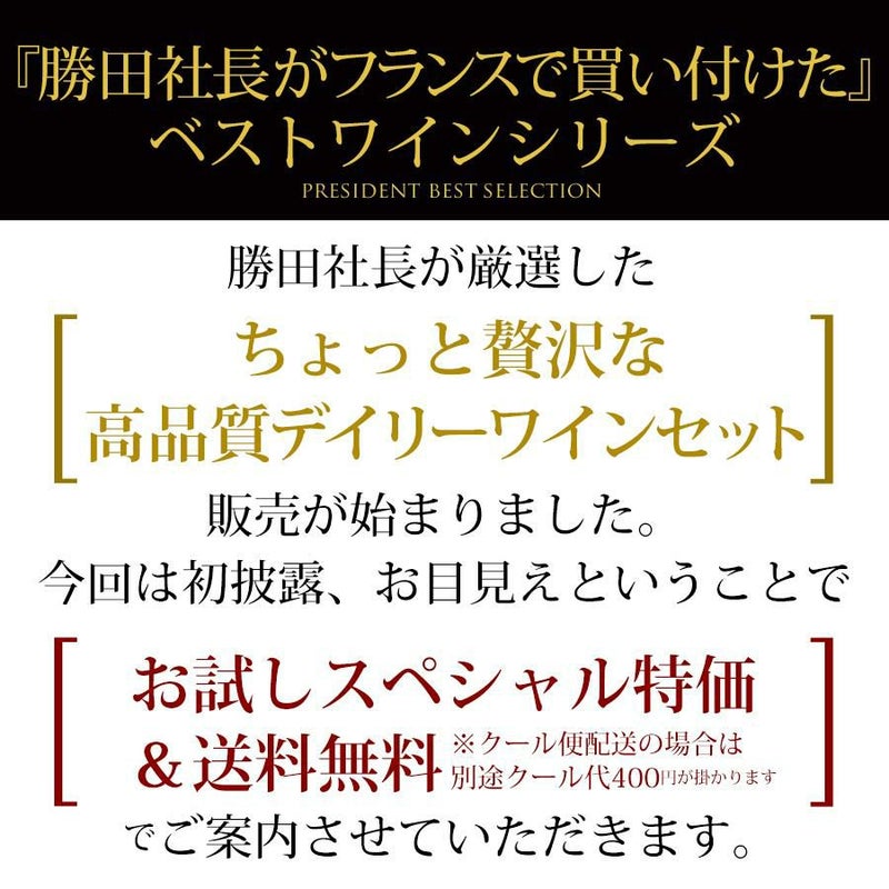勝田社長がフランスで買い付けた「ちょっと贅沢な高品質デイリーシャンパン・セット」販売が始まりました。今回は初披露、お目見えということで更にお試しスペシャル特価&送料無料で販売させていただきます!
