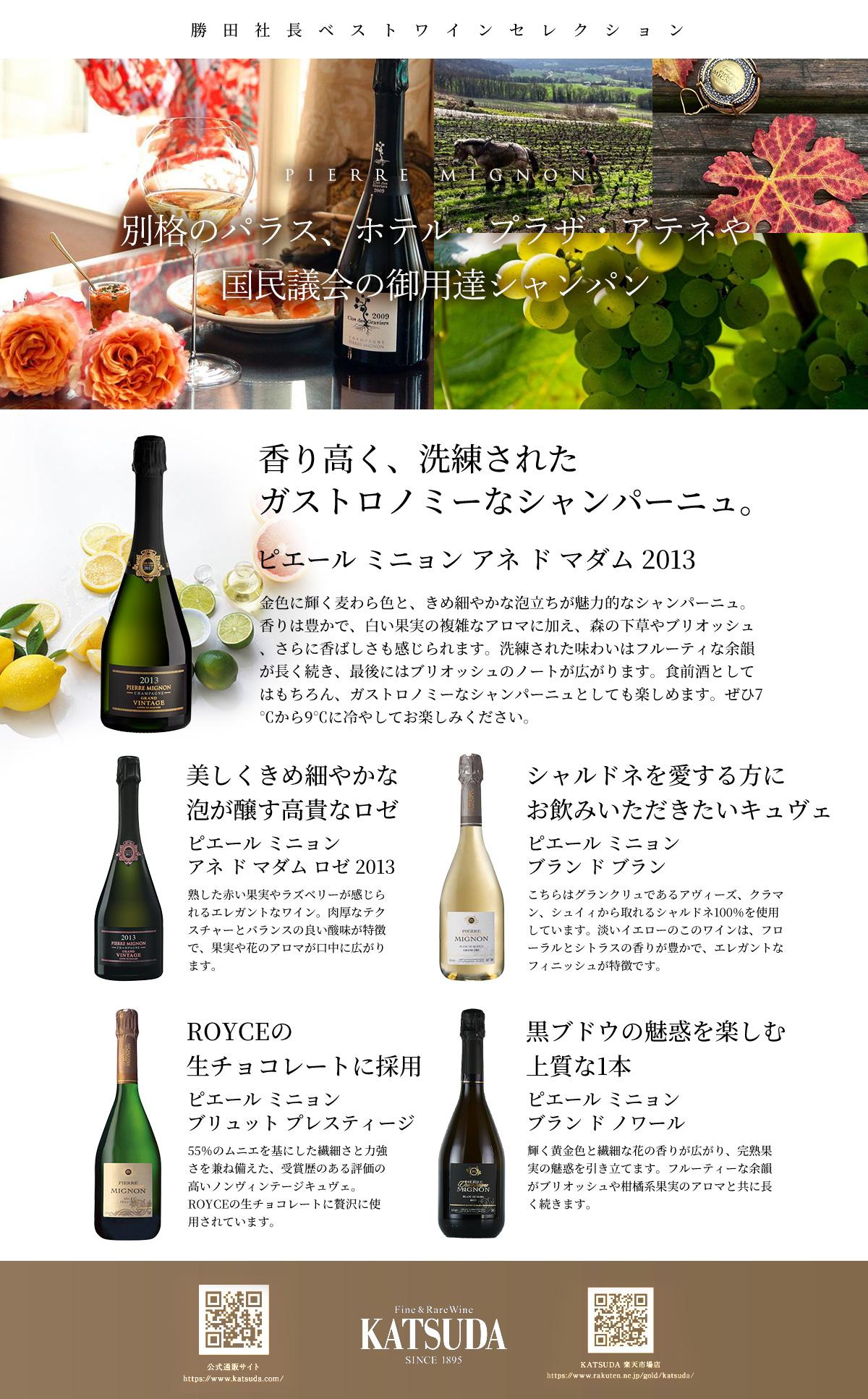 他の画像を見る 別格のパラス「ホテル・プラザ・アテネ」や国民議会の御用達シャンパン 【12%OFF | P10倍】勝田社長★ベストシャンパン ピエール ミニョン《白・ロゼ》☆ヴィンテージキュヴェ 2本セット お試しスペシャル特価 送料無料【ceo】 通常販売価格(税込) ¥ 18,800 税込 会員メンバー価格(税込) ¥ 16,480 税込 送料無料 クール便対応可能 販売開始前です。 販売期間 2026/03/12 8:00 〜 2026/03/31 23:59 詳細を見る お気に入りに追加