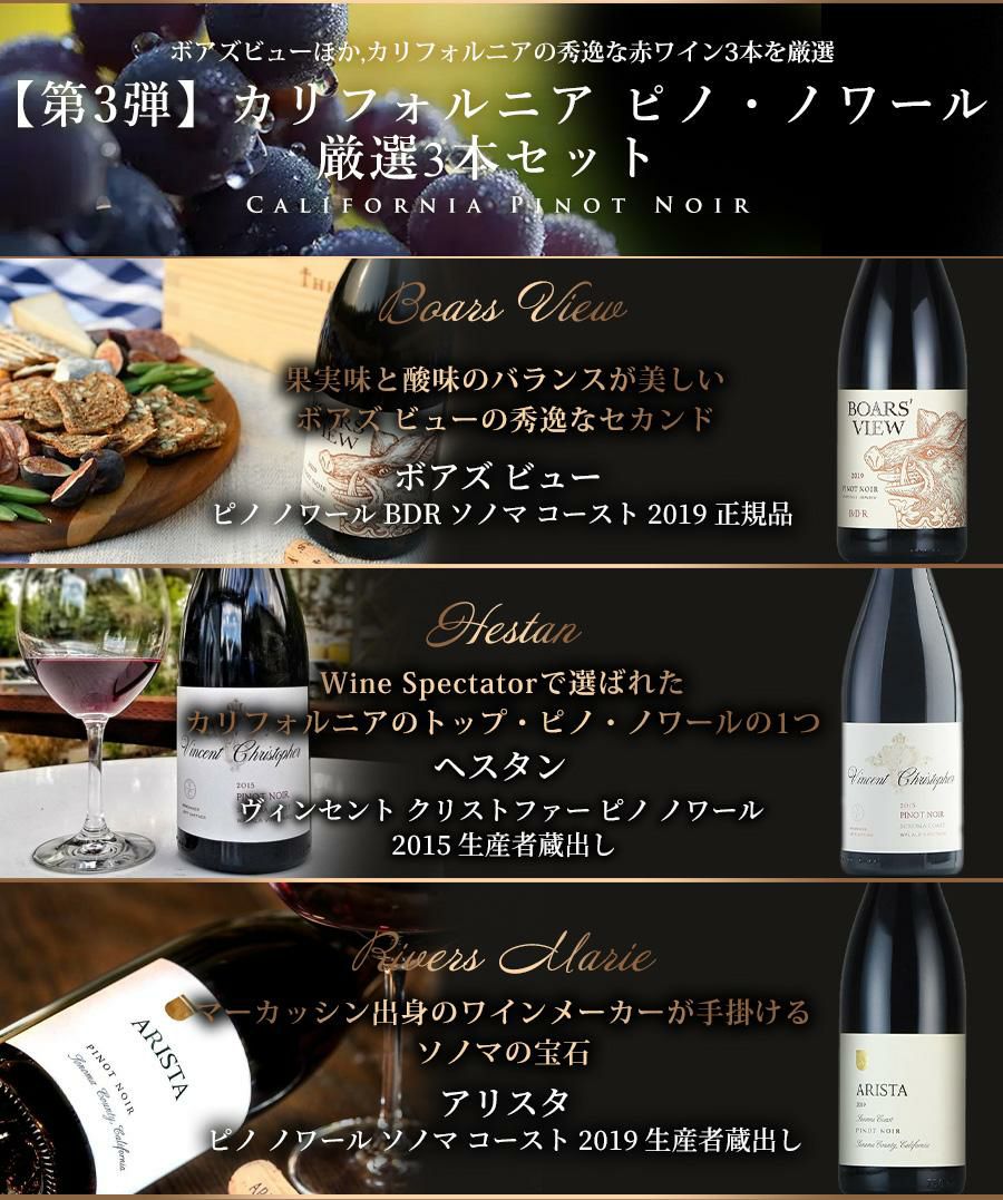 他の画像を見る 【第3弾】ワインセット カリフォルニア 《カリフォルニアの芳醇なピノノワールを愉しむ 厳選3本》 ボアズ ビュー/アリスタ/へスタン福袋 送料無料 通常販売価格(税込) ¥ 49,500 税込 会員メンバー価格(税込) ¥ 33,800 税込 送料無料 詳細を見る お気に入りに追加