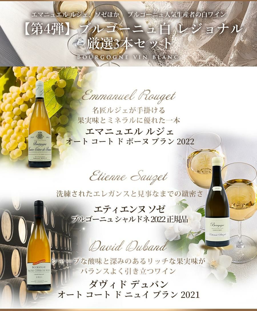 他の画像を見る 【第4弾】ワインセット ブルゴーニュ 白ワイン超優良生産者のAOCブルゴーニュEmmanuel Rouget エマニュエル ルジェ、Etienne Sauzet エティエンヌ ソゼ、他 厳選3本 福袋 送料無料 通常販売価格(税込) ¥ 37,510 税込 会員メンバー価格(税込) ¥ 32,800 税込 送料無料 詳細を見る お気に入りに追加